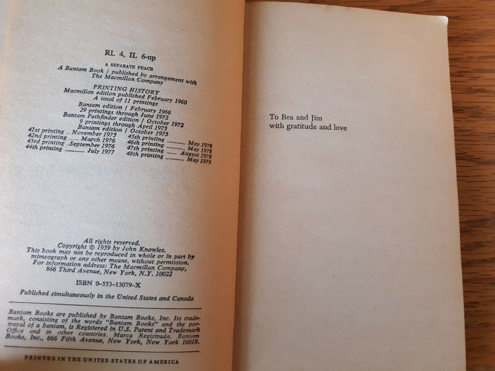 A Separate Peace John Knowles 1979 Bantam Books Paperback